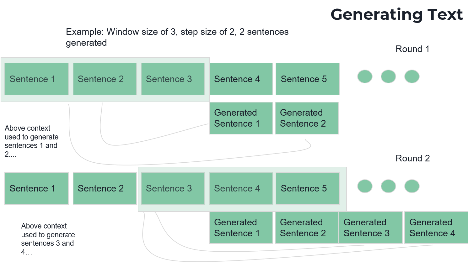 This the process of generating new text from our corpus of data outlined in above sections. The algorithm for generating text takes as input a pre-trained GPT-2 and a text file. The text file is chunked into contiguous groups of sentences which are used as prompts for GPT-2. The contiguous group is then shifted by some step size. For this project, the chunk/window size was 9 and the step size was 4. 4 sentences were generated at a time using GPT-2. We used nltk as the sentence tokenizer. A diagram showing this algorithm is shown below: