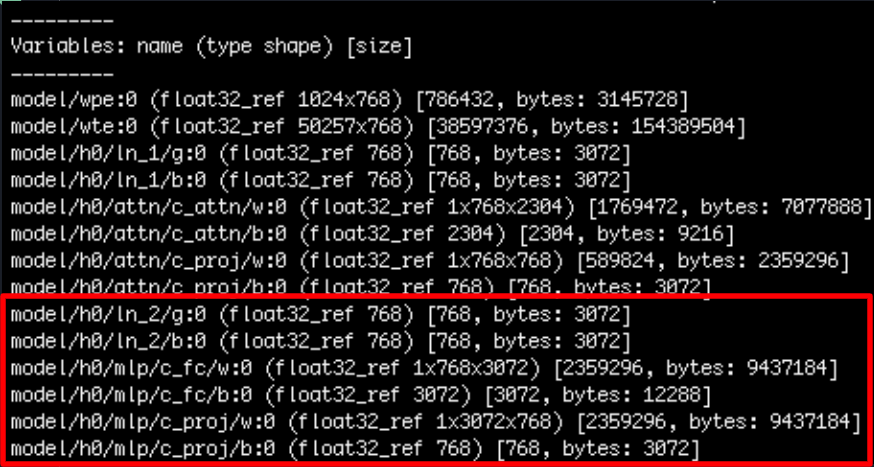 The red box indicates the weights and bias parameters contained in the first decoder block. the 'c_fc' stands for perceptron layer, while 'c_proj' stands for the projection layer. Both of these can be distributed as a package to exploit model parallelism. The below code section demonstrates how we implemented this idea.