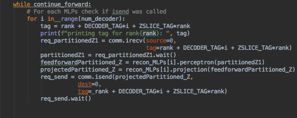 From line 56 to line 61, the master process serializes the decoder blocks' MultiLayerPerceptron instances. Then, in line 64, the serialized MLPs are broadcast to all the nodes using OpenMPI (mpi4py).
